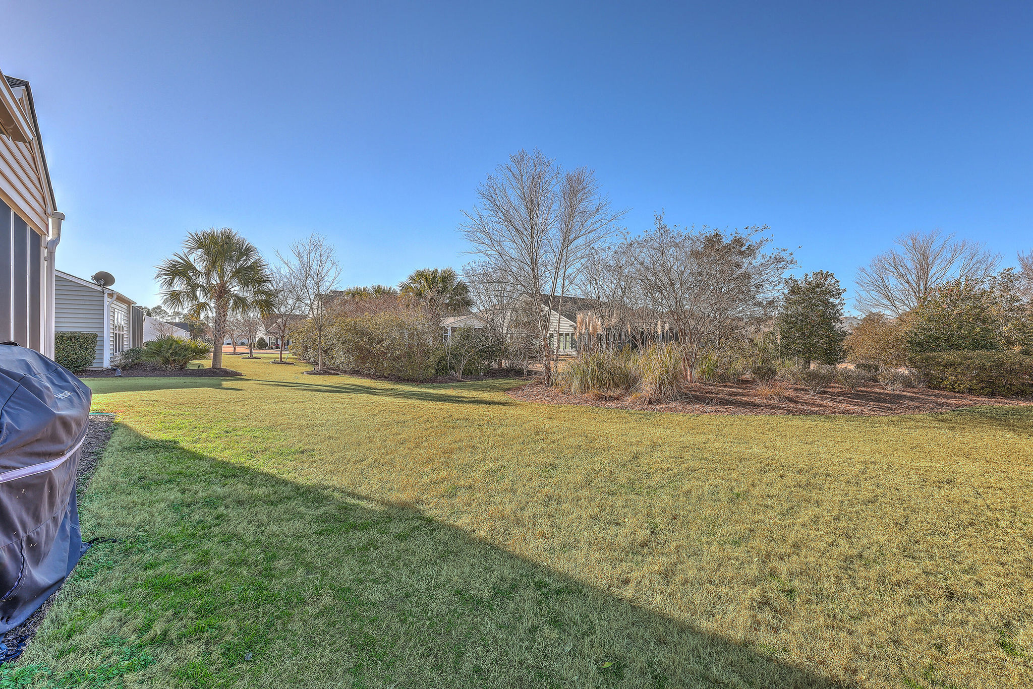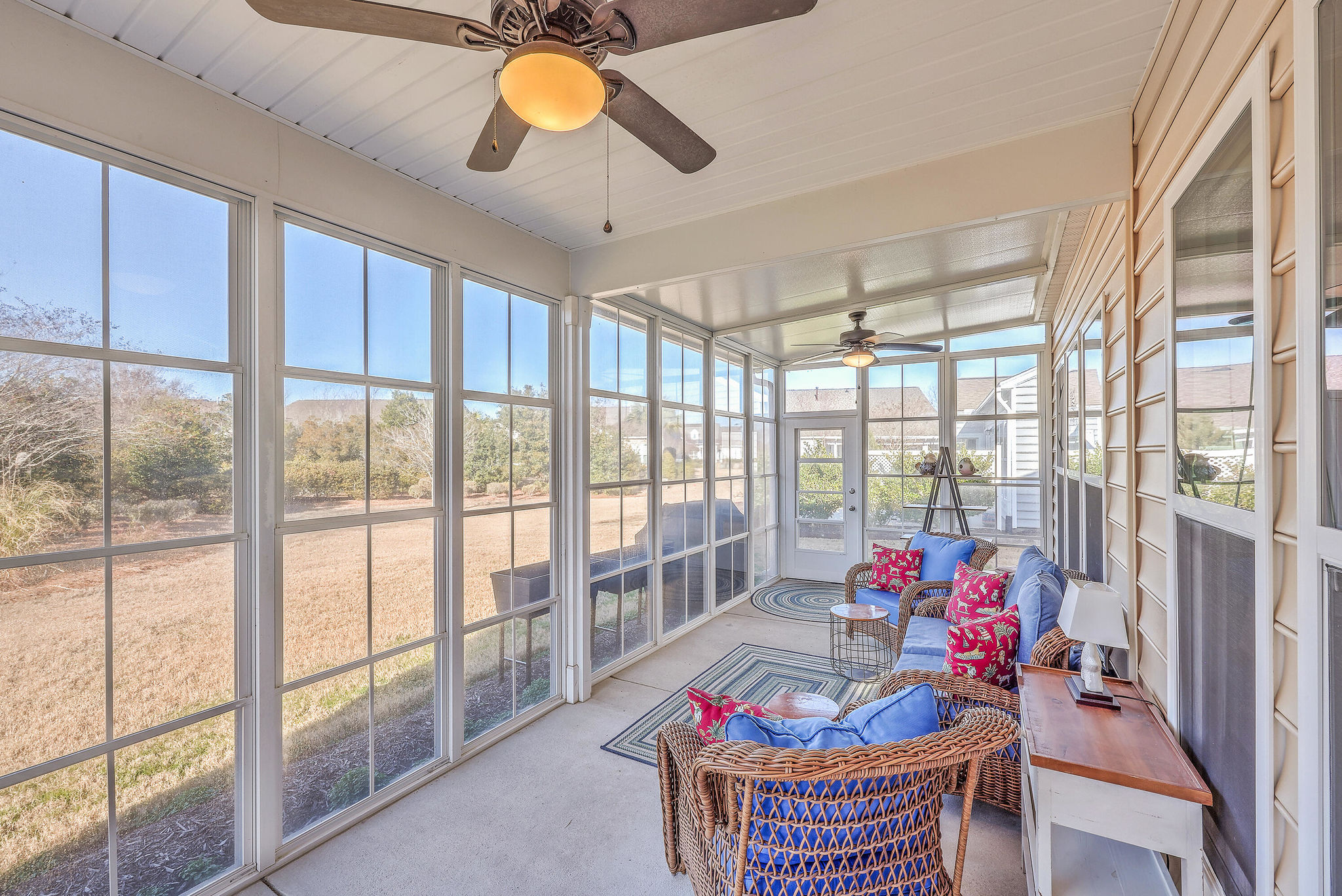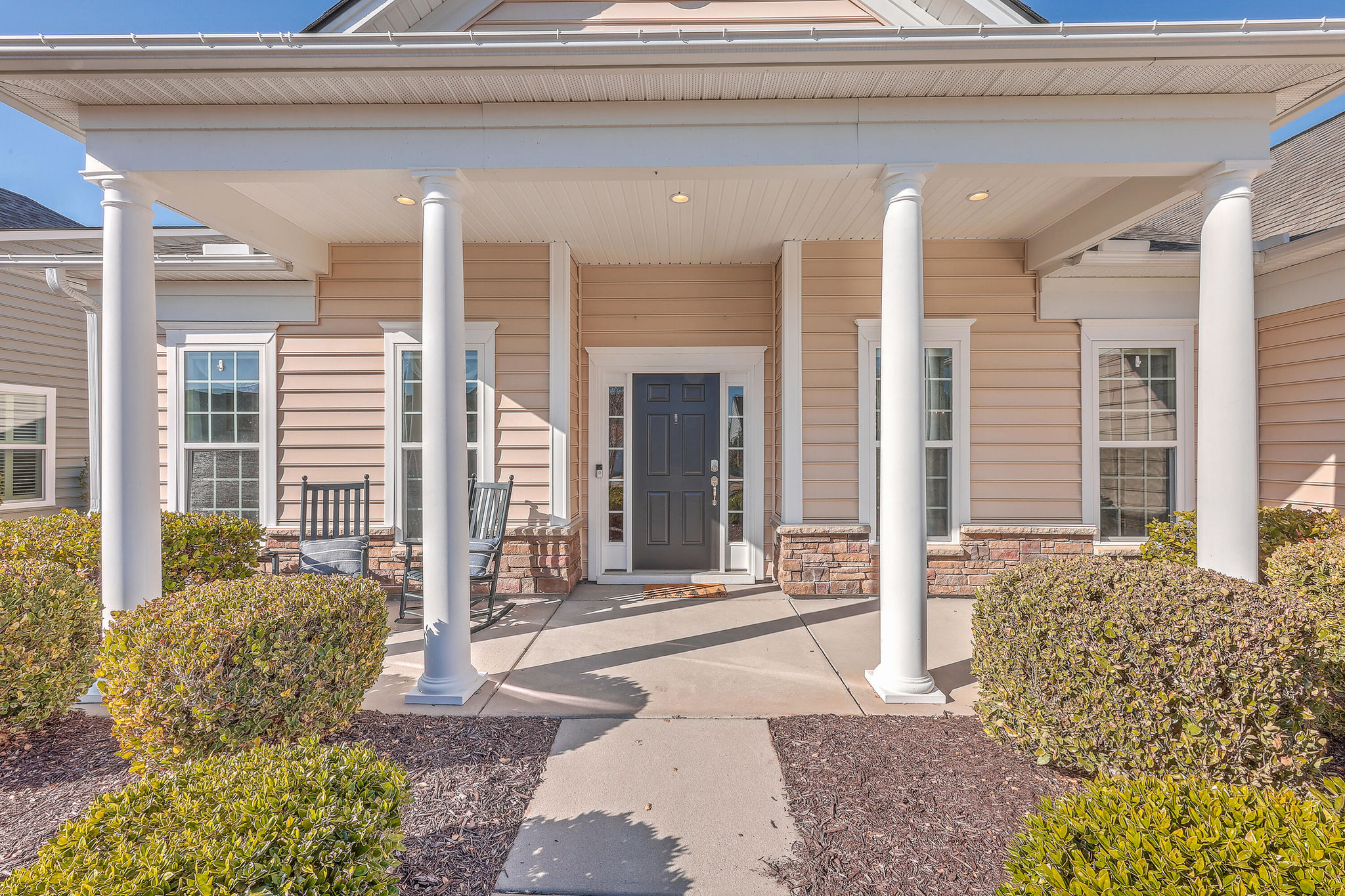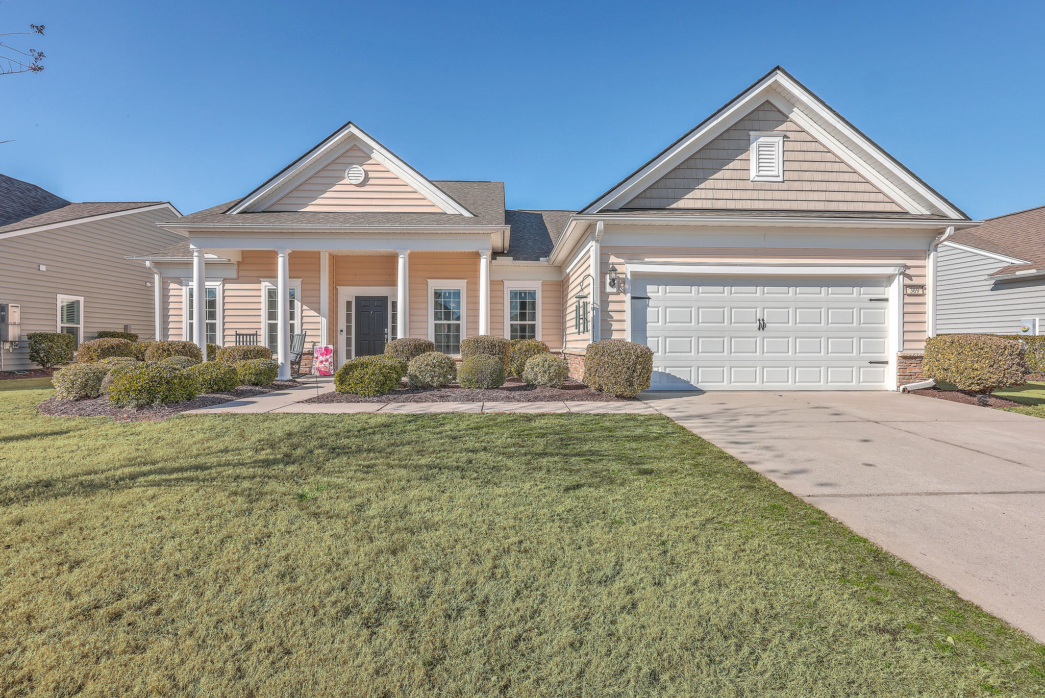 A grand full front porch with elegant columns and stone detailing welcomes you to this beautiful home. Step inside, and you're immediately greeted by rich hardwood floors that flow seamlessly from the foyer into the great room, dining room, kitchen, breakfast nook and hallways, creating a warm and inviting atmosphere… Read Morethroughout.The well-appointed kitchen overlooks the spacious great room and is designed for both functionality and style.It features upgraded quartz countertops, a stylish tile backsplash, staggered cabinetry with crown molding, pull-out shelving in the lower cabinets, recessed can lighting, and high-end stainless steel appliances, including a built-in wall oven, microwave, and a 5-burner gas cooktop. At the back of the home, a light-filled sunroom offers the perfect space for relaxation. Just beyond, an oversized screened-in lanai with vinyl windows extends your living space year-round, making it ideal for entertaining or enjoying peaceful moments with friends and family. The backyard is a private retreat, with lush landscaping creating a serene and tranquil setting. Thanks to the home's thoughtful positioning, you'll enjoy plenty of privacy while savoring the beauty of your surroundings. Inside, the spacious primary suite is a true sanctuary, complete with a luxurious bath featuring granite countertops, tiled flooring, a double vanity, a walk-in shower, and a large walk-in closet. On the opposite side of the home, the second and third bedrooms are thoughtfully separated to offer guests maximum privacy. The second bedroom is versatile enough to serve as both a bedroom and an office/den, or even a second primary suite. A well-appointed guest bathroom with granite countertops is conveniently located between the second and third bedrooms. This is a very active 55+ community. Amenities include a large indoor pool and outdoor pool, a full exercise gym, tennis courts, a playground, and plenty of walking/jogging trails. Located in Del Webb at Cane Bay Plantation, this home offers the perfect blend of comfort, privacy, and convenience. Don't miss your chance to tour this incredible propertybook your showing today! Use preferred lender to buy this home and receive an incentive towards your closing costs!Read Less