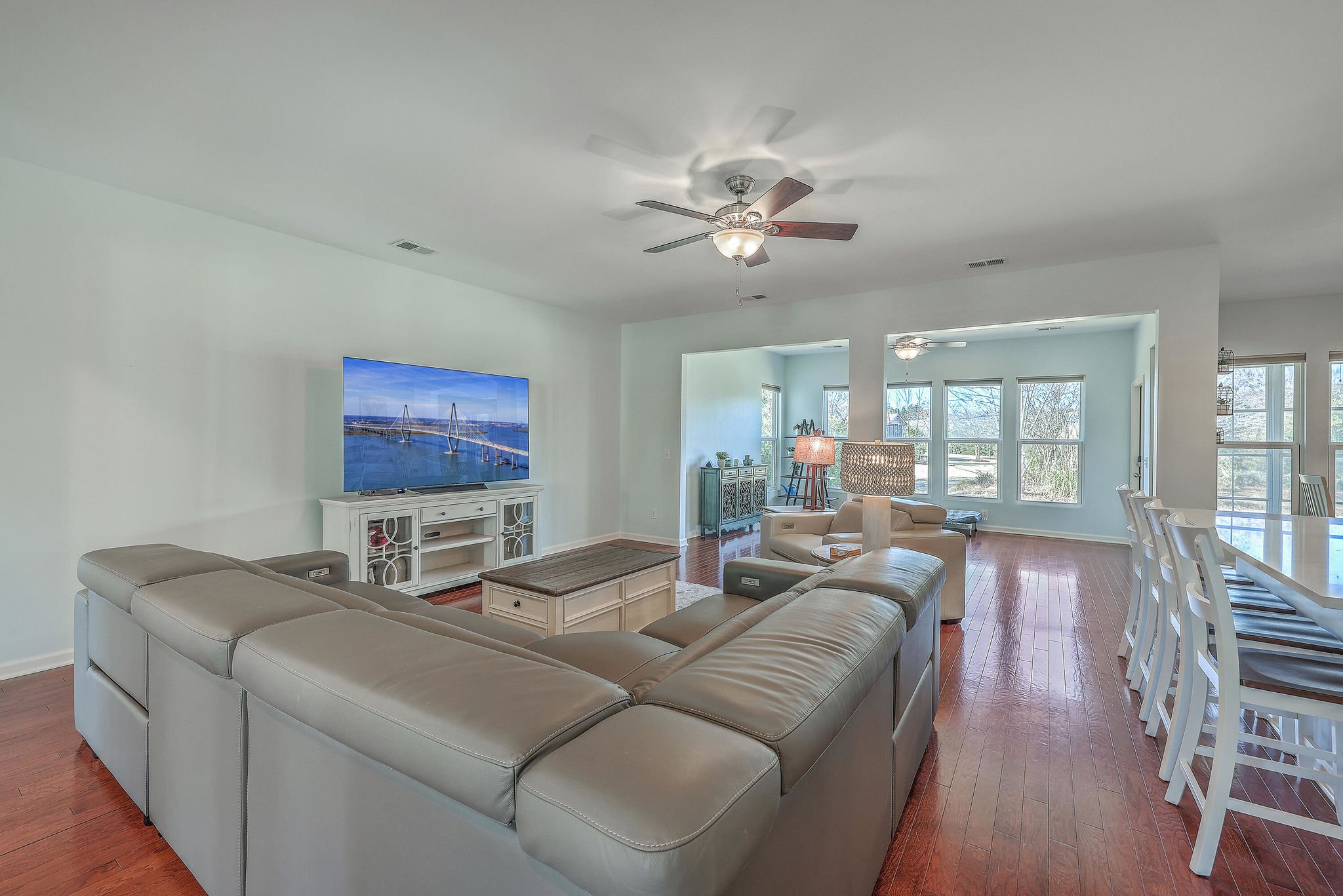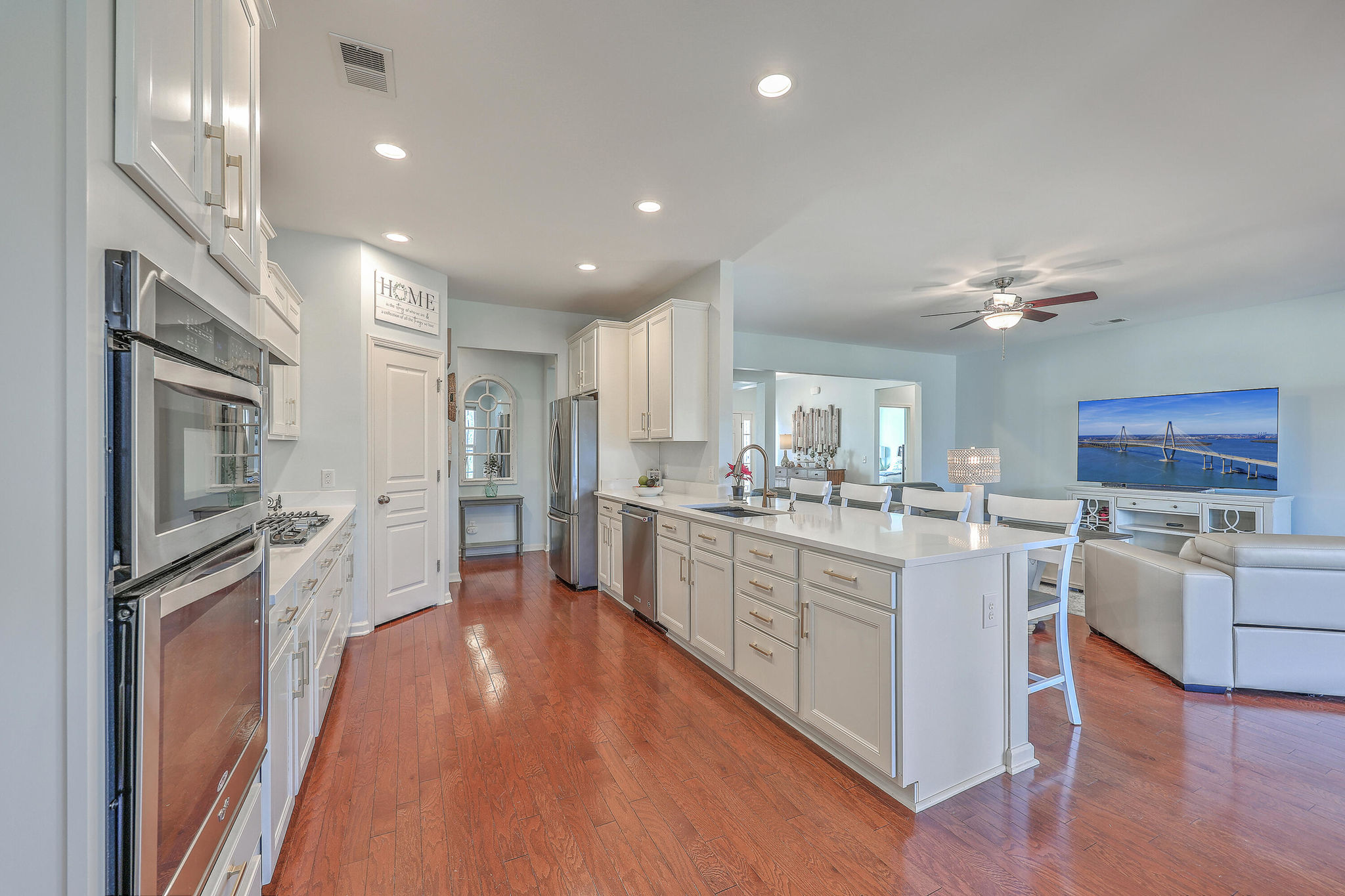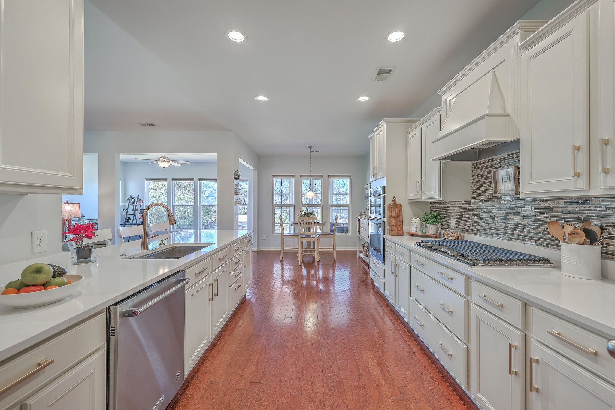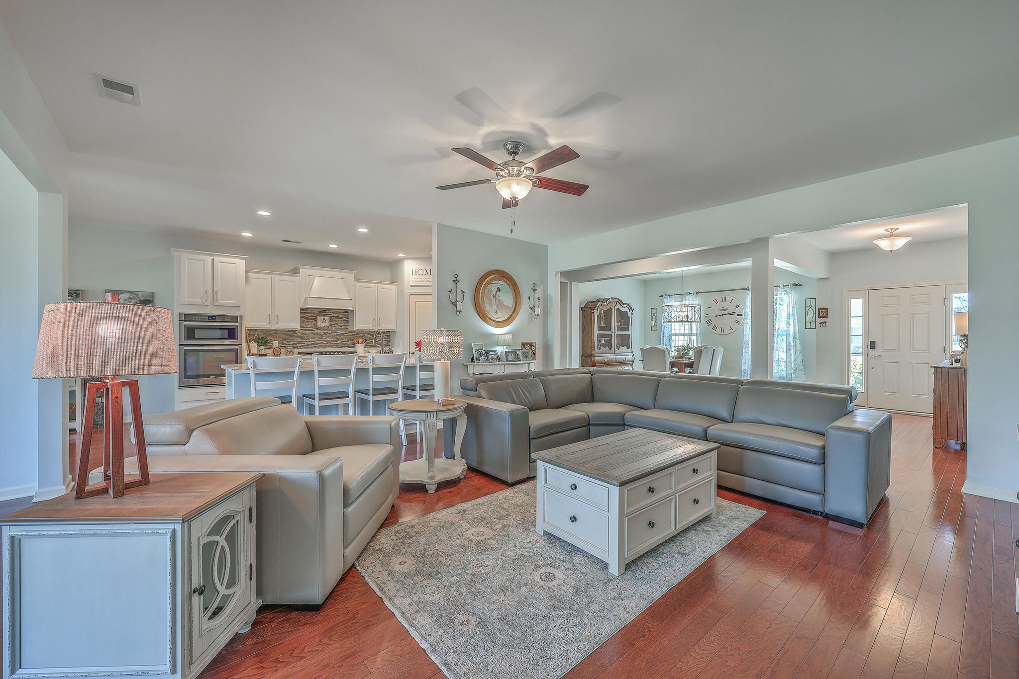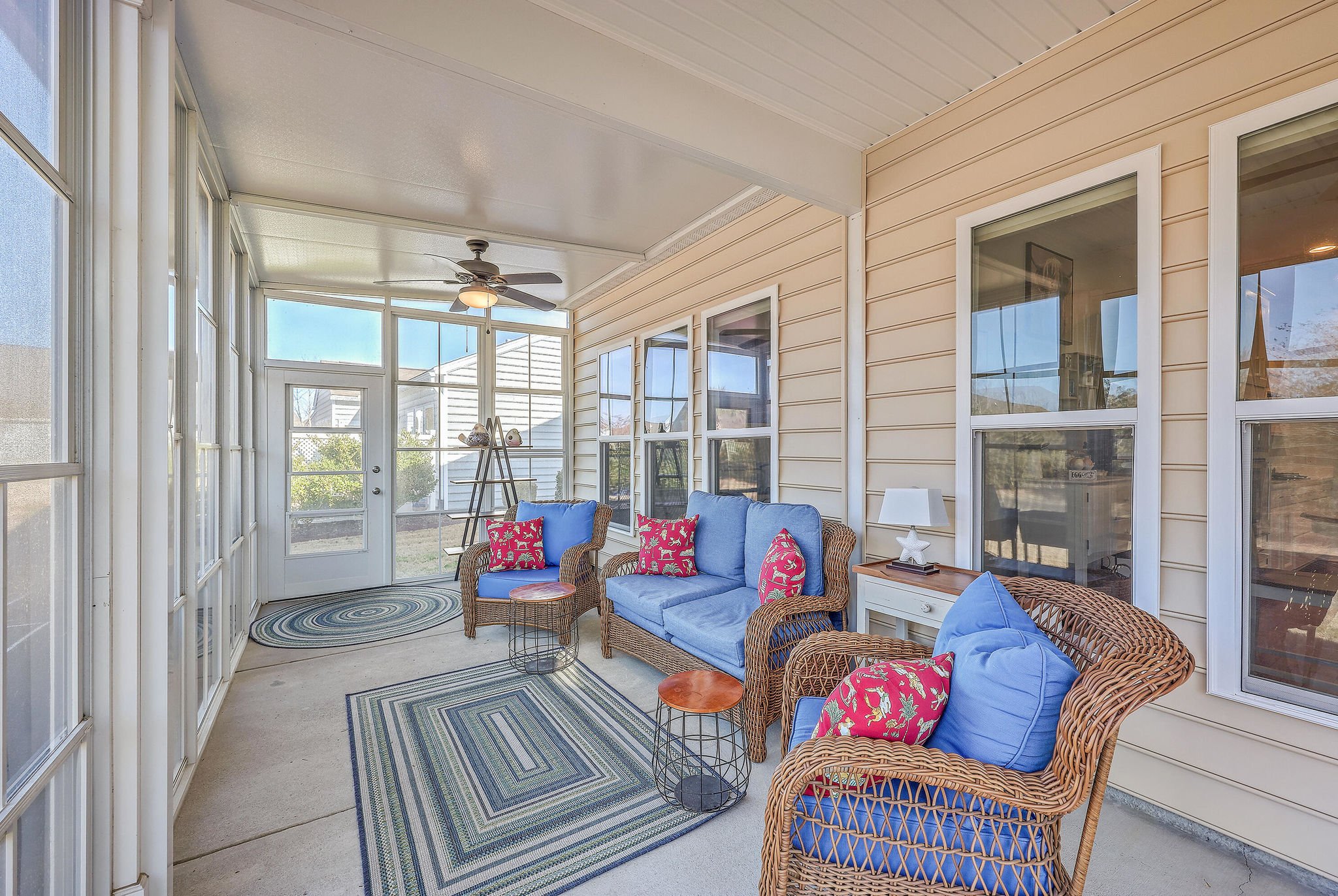 A grand full front porch with elegant columns and stone detailing welcomes you to this beautiful home. Step inside, and you're immediately greeted by rich hardwood floors that flow seamlessly from the foyer into the great room, dining room, kitchen, breakfast nook and hallways, creating a warm and inviting atmosphere… Read Morethroughout.The well-appointed kitchen overlooks the spacious great room and is designed for both functionality and style.It features upgraded quartz countertops, a stylish tile backsplash, staggered cabinetry with crown molding, pull-out shelving in the lower cabinets, recessed can lighting, and high-end stainless steel appliances, including a built-in wall oven, microwave, and a 5-burner gas cooktop. At the back of the home, a light-filled sunroom offers the perfect space for relaxation. Just beyond, an oversized screened-in lanai with vinyl windows extends your living space year-round, making it ideal for entertaining or enjoying peaceful moments with friends and family. The backyard is a private retreat, with lush landscaping creating a serene and tranquil setting. Thanks to the home's thoughtful positioning, you'll enjoy plenty of privacy while savoring the beauty of your surroundings. Inside, the spacious primary suite is a true sanctuary, complete with a luxurious bath featuring granite countertops, tiled flooring, a double vanity, a walk-in shower, and a large walk-in closet. On the opposite side of the home, the second and third bedrooms are thoughtfully separated to offer guests maximum privacy. The second bedroom is versatile enough to serve as both a bedroom and an office/den, or even a second primary suite. A well-appointed guest bathroom with granite countertops is conveniently located between the second and third bedrooms. This is a very active 55+ community. Amenities include a large indoor pool and outdoor pool, a full exercise gym, tennis courts, a playground, and plenty of walking/jogging trails. Located in Del Webb at Cane Bay Plantation, this home offers the perfect blend of comfort, privacy, and convenience. Don't miss your chance to tour this incredible propertybook your showing today! Use preferred lender to buy this home and receive an incentive towards your closing costs!Read Less